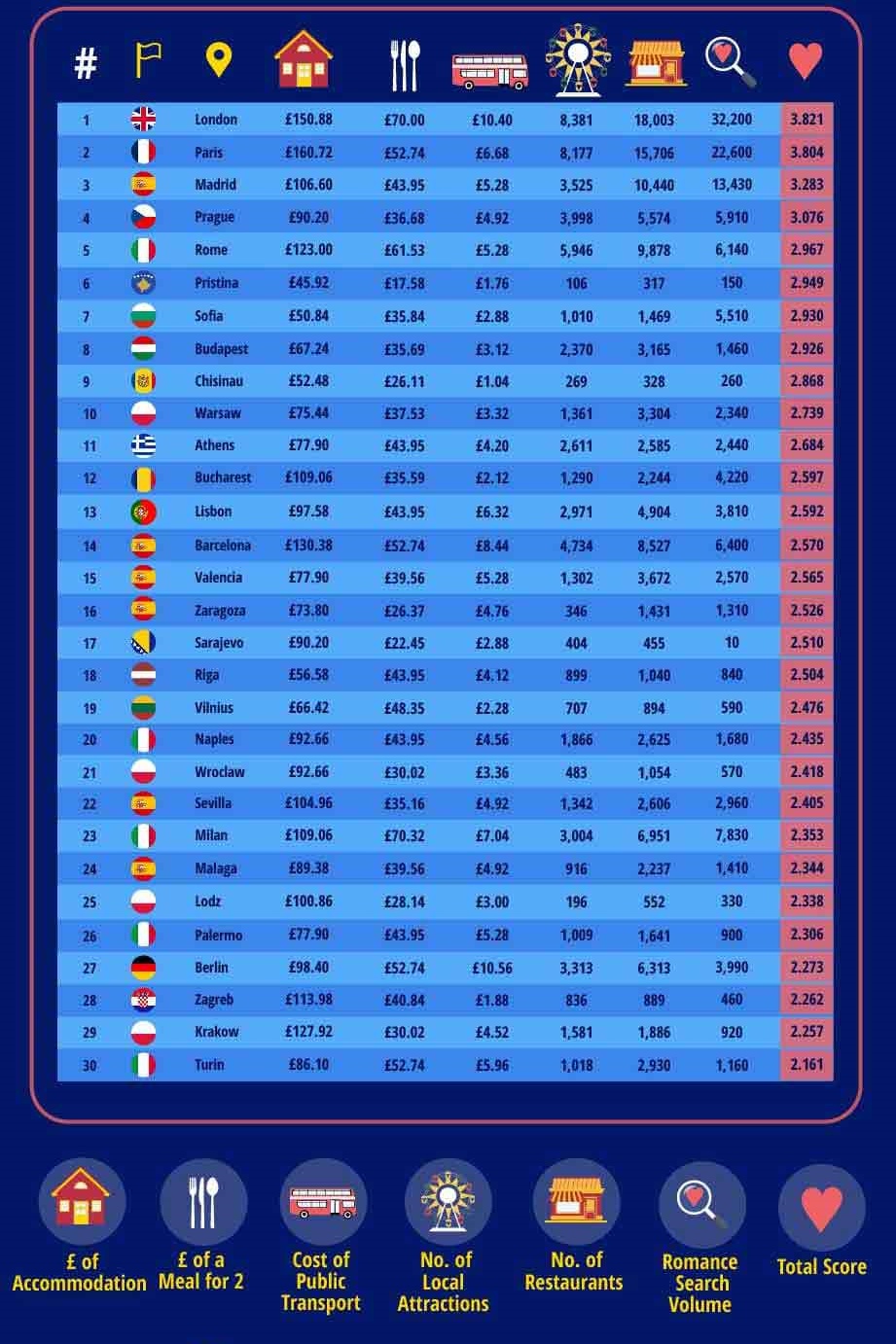 Με αφορμή αυτό, η Comparethemarket δημιούργησε ένα ευρετήριο που κατατάσσει μερικές από τις καλύτερες πόλεις στην Ευρώπη για ένα σύντομο διάλειμμα την Ημέρα του Αγίου Βαλεντίνου, με βάση διάφορων παραγόντων, όπως τον αριθμός των τοπικών αξιοθέατων, το κόστος ενός γεύματος για δύο και το κόστος διαμονής.