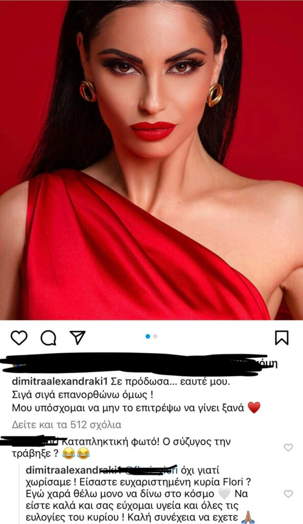 “Όχι, γιατί χωρίσαμε. Είσαστε ευχαριστημένη κυρία μου; Εγώ χαρά θέλω να δίνω στον κόσμο. Να είστε καλά και σας εύχομαι υγεία και όλες τις ευλογίες του κυρίου. Καλή συνέχεια”, ήταν τα λόγια της Δήμητρας Αλεξανδράκη.