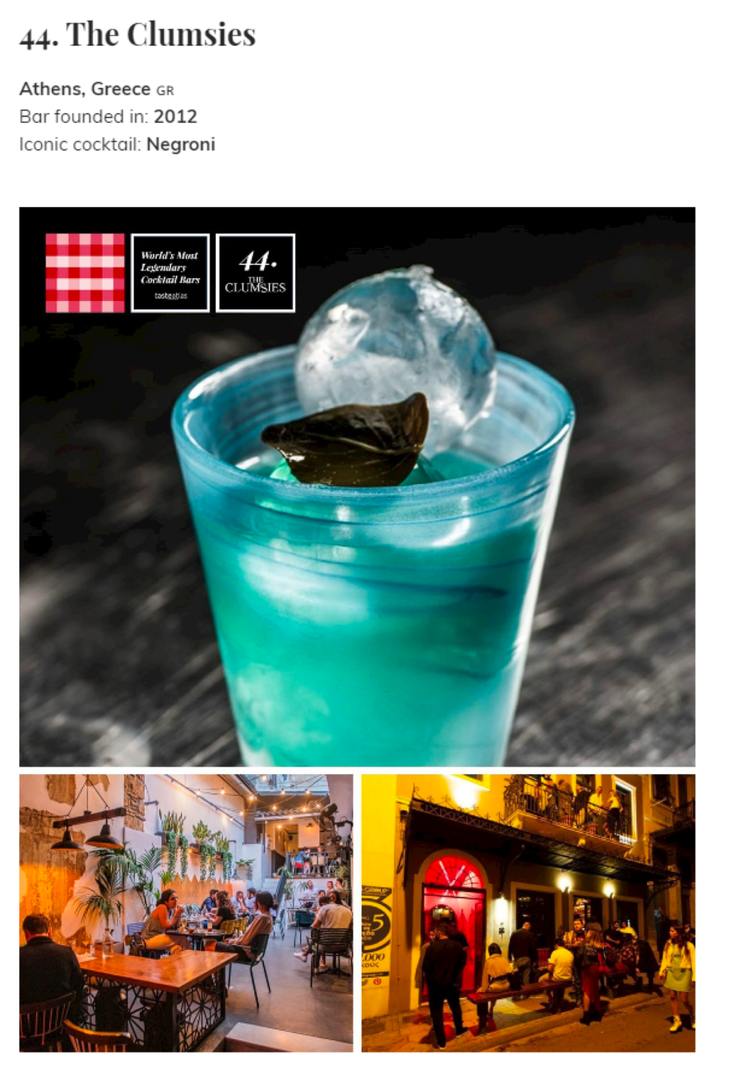 Ο λόγος για το αθηναϊκό μπαρ The Clumsies που βρίσκεται στην 44η θέση της λίστας του Taste Atlas φέροντας πλέον τον βαρύ τίτλο ενός από τα θρυλικότερα μπαρ σε όλο τον κόσμο. Όπως αναφέρει το protothmema.gr, ως ποτό σήμα κατατεθέν του, αναφέρεται στην σχετική λίστα το παραδοσιακό Negroni, αλλά και η ξεχωριστή έκδοση του Clumsies, το Aegean Negroni.