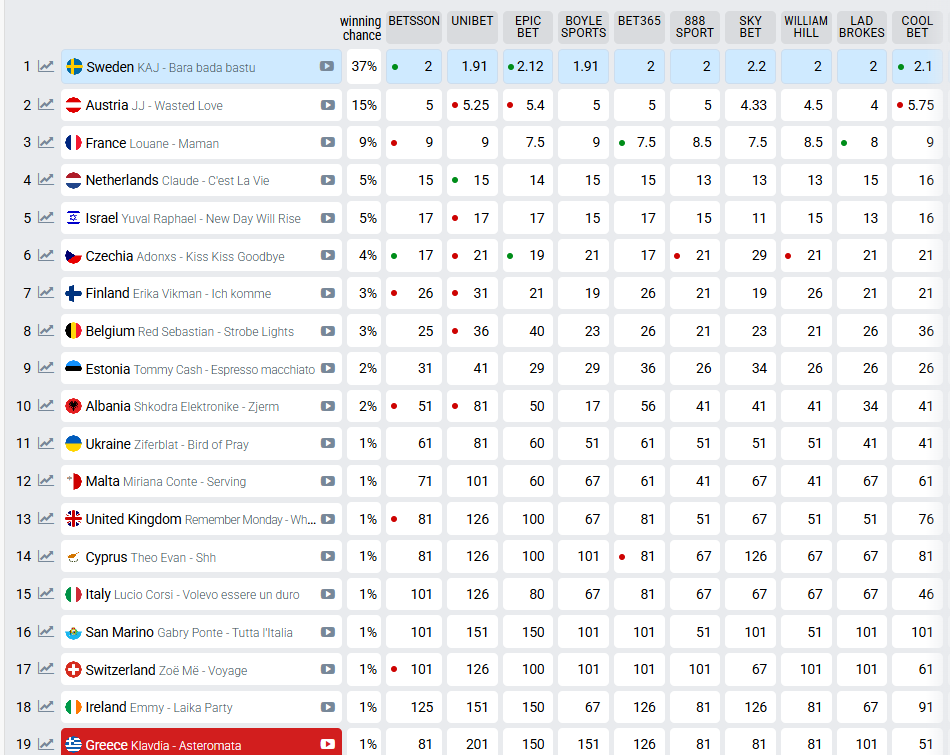 Σε πλήρη αντίθεση με την εικόνα της Ελλάδας, η Σουηδία φιγουράρει σταθερά στην κορυφή των προγνωστικών με τους KAJ και το τραγούδι «Bara bada bastu», διεκδικώντας ακόμα μία νίκη στον θεσμό. Την πεντάδα των φαβορί συμπληρώνουν οι συμμετοχές από Αυστρία, Γαλλία, Ισραήλ και Ολλανδία.