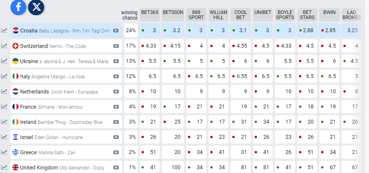 Παρόλα’ αυτά, η σελίδα Eurovision World «κατέβασε» την ελληνική αποστολή στην 9η θέση. Ο Baby Lasagna από την Κροατία με το «Rim Tim Tagi Dim» βρίσκεται πάλι στην πρώτη θέση, και δεύτερος είναι ο Ελβετός Nemo με το «Code».