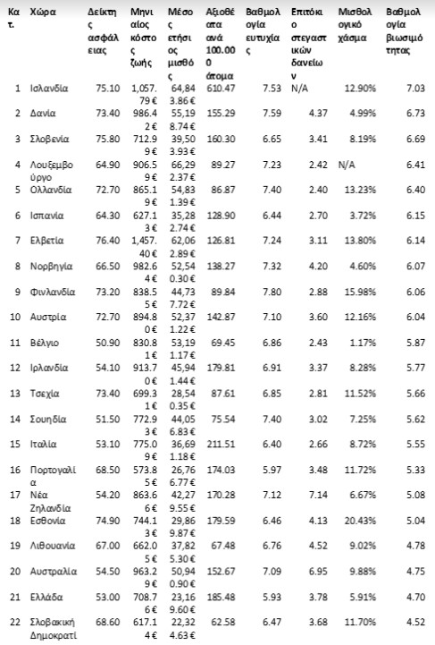 Η Ελλάδα βρίσκεται στην 21η θέση από τις 35 χώρες παγκοσμίως που αναλύθηκαν με 53/100 δείκτη ασφαλείας, 5.93/10 βαθμολογία ευτυχίας και μόλις 5.91% δείκτη μισθολογικού χάσμα ανάμεσα στα δύο φύλα.