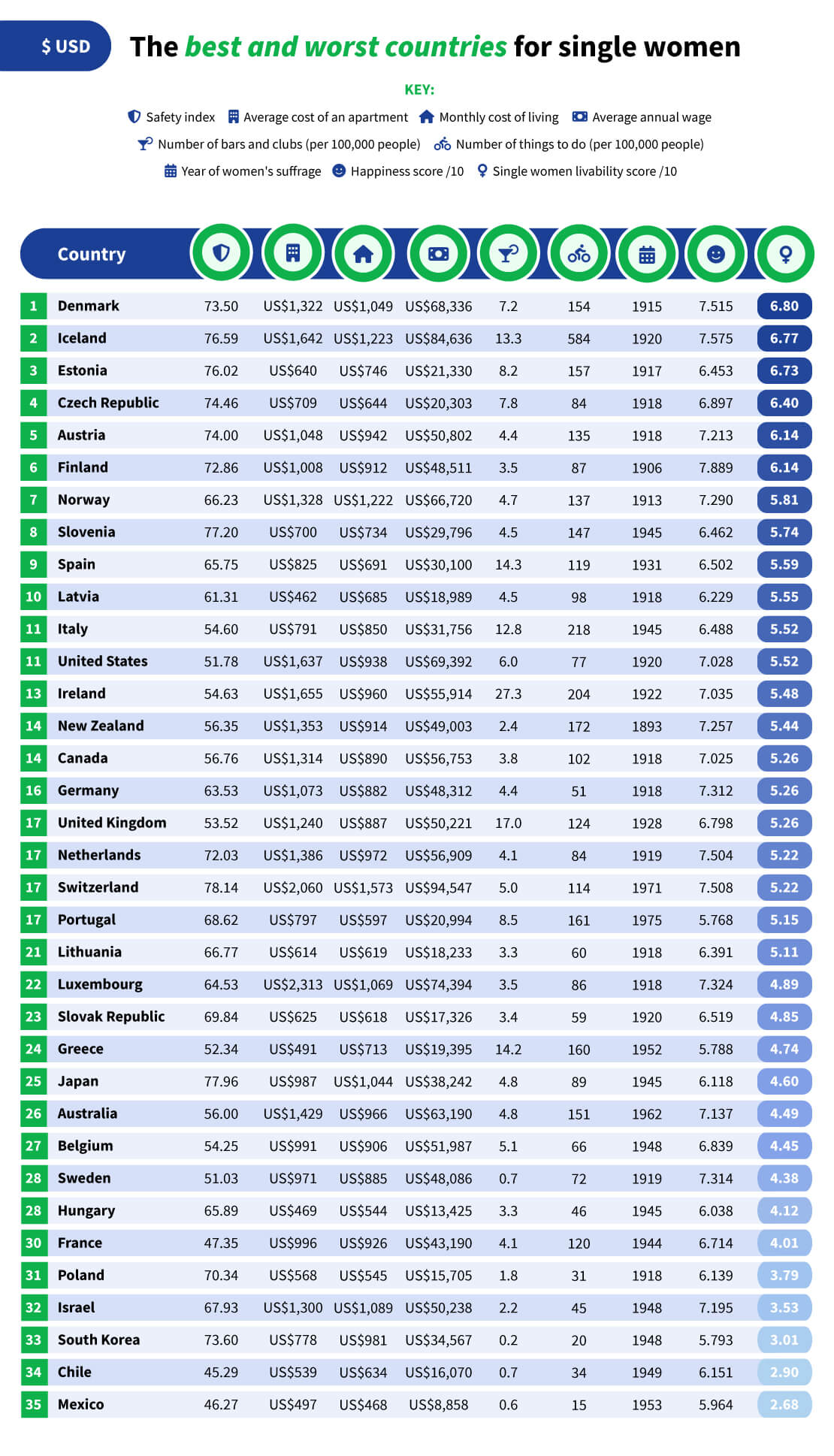 Η Ισλανδία ανακηρύχθηκε η καλύτερη χώρα για τις single γυναίκες, χάρη στην υψηλή βαθμολογία ασφάλειας και ευτυχίας της χώρας, τον υψηλό ετήσιο μισθό και τον αριθμό δραστηριοτήτων στην περιοχή, ενώ από την άλλη πλευρά, το Μεξικό αποκαλύπτεται ως η χειρότερη χώρα, έχοντας τον χαμηλότερο ετήσιο μισθό από τις χώρες που μελετήθηκαν, καθώς και μια από τις χαμηλότερες βαθμολογίες ασφάλειας. Ωστόσο, η χώρα έχει το φθηνότερο κόστος ζωής μεταξύ των χωρών που μελετήθηκαν.