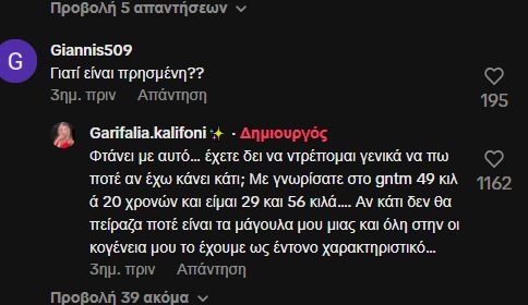 Απαντώντας στο σχόλιο «Γιατί είναι πρησμένη;», η Γαρυφαλλιά Καληφώνη έγραψε: