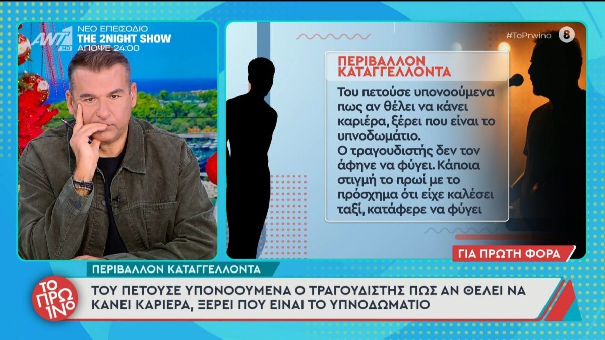 Διότι δεν ξέρω κατά πόσον θα τεκμηριωθούν οι καταγγελίες που θα ακούσετε σήμερα. Σας είχα πει εχθές, μιλάμε για τον πολύ γνωστό, δημοφιλή Έλληνα τραγουδιστή.