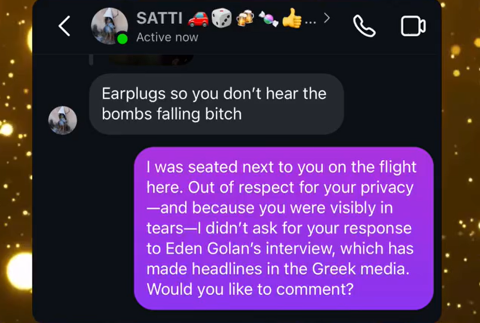 Η αντίδραση της Μαρίνας Σάττι ήταν σχεδόν άμεση και —όπως θα περίμενε κανείς— καθόλου διπλωματική. Σε προσωπικό μήνυμα προς τον δημοσιογράφο, του έγραψε: «Ωτοασπίδες; Βάλ’ τες στα αυτιά σου για να μην ακούς τις βόμβες που πέφτουν, bitch.»
