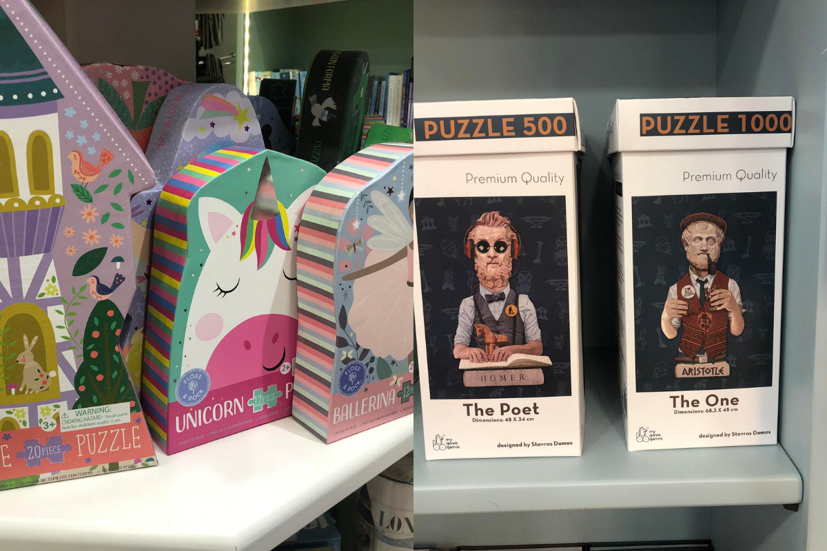 Ιδιαίτερα πάζλ για διάφορες ηλικίες είναι μία κλασική επιλογή για δώρο. Στην πρώτη φωτογραφία έχουμε παζλ για τους μικρούς μας φίλούς που θα τους βοηθήσει να ακονίσουν την παρατηρητικότητά τους και να εξελίξουν τις κινητικές τους ικανότητες από 12 έως 20 κομμάτια.