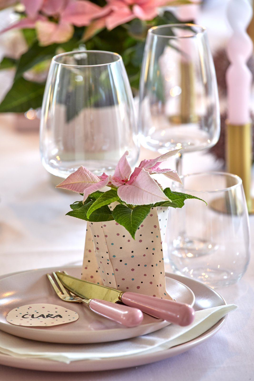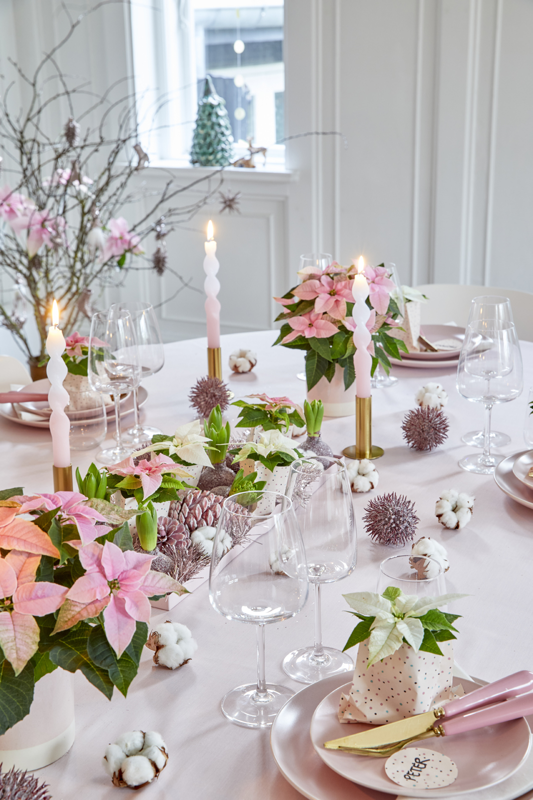 Το ροζ, το ανοιχτό πράσινο και το λευκό δίνουν έναν ρομαντικό αέρα σε αυτό το εορταστικό τραπέζι. Στο κέντρο του τραπεζιού, ένας δίσκος γεμάτος με μίνι αλεξανδρινά σε χειροποίητες χάρτινες σακούλες, υάκινθους και κερωμένους κώνους τραβάει τα βλέμματα. Στριφτά κεριά σε χρυσά κηροπήγια, πλούσια ανθισμένα αλεξανδρινά σε ταιριαστά κασπό, παγωμένα φρούτα ραμπουτάν και διάσπαρτα άνθη βαμβακιού συνθέτουν το τέλειο σκηνικό του τραπεζιού.