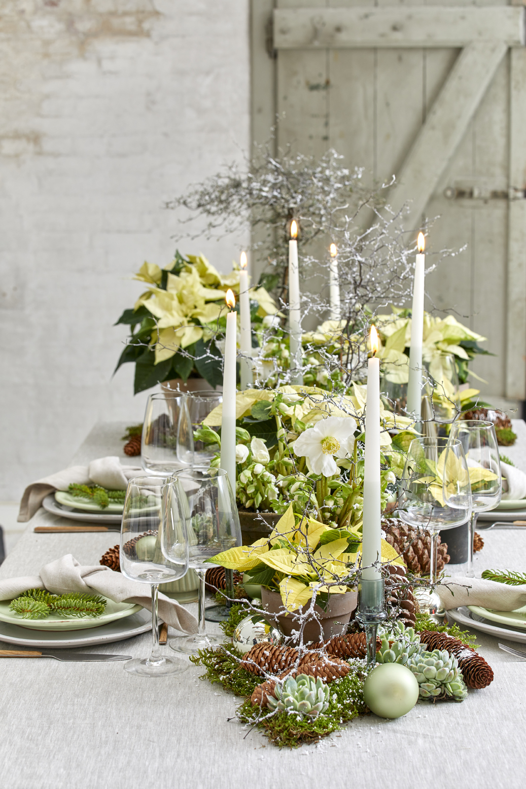Κομψό και φυσικό ταυτόχρονα, αυτό το πλούσιο επιτραπέζιο σκηνικό αποτελείται από κρεμ αλεξανδρινά, ζιγκ-ζαγκ θάμνους και αχλαδιές σε διάφορα μεγέθη. Προσθέστε μολόχα, κουκουνάρια, κλαδιά έλατου και εχεβερία, καθώς και χιόνι σε σπρέι και στολίδια σε ίδιες αποχρώσεις, τα οποία με τα δίχρωμα λευκά και πράσινα κηροπήγια προσφέρουν ατμοσφαιρικό φως.