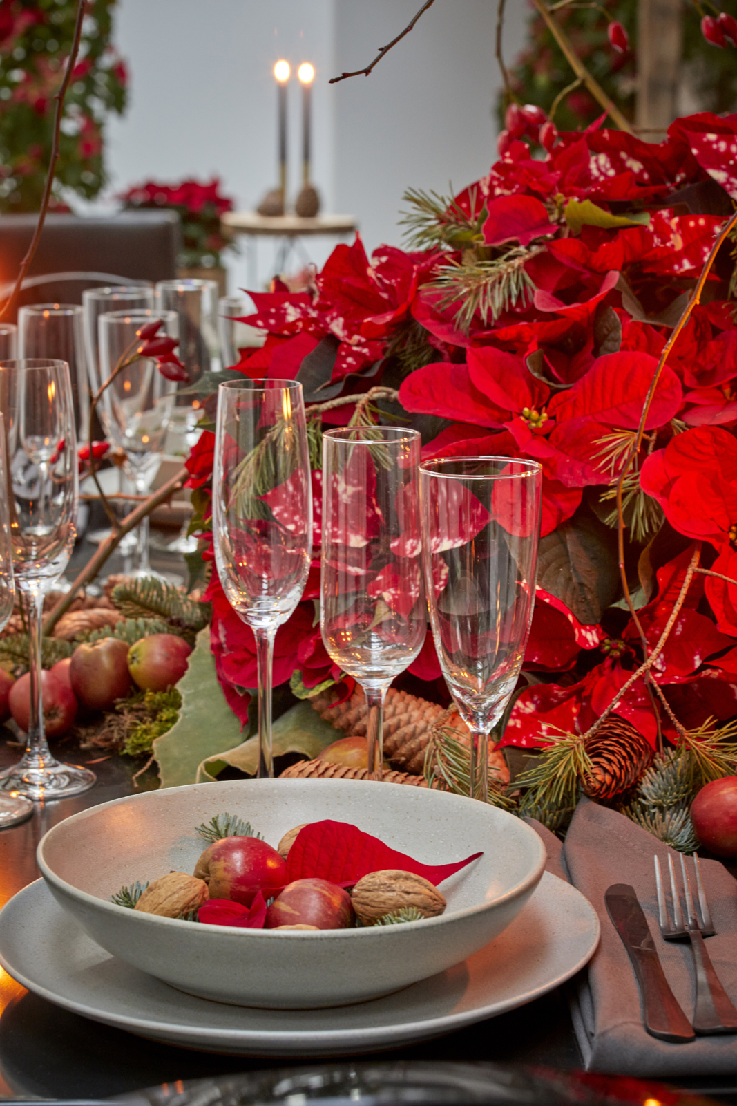 Ως σύνθεση για το κέντρο του τραπεζιού, αυτό το μπολ με τα κόκκινα αλεξανδρινά προσδίδει εκθαμβωτικό χαρακτήρα στο γιορτινό χριστουγεννιάτικο τραπέζι. Κλαδιά ελάτης, ξηροί καρποί και μήλα τοποθετημένα μέσα και γύρω από το μπολ συνθέτουν το τέλειο φυσικό σκηνικό. Συμβουλή: Οι ποικίλες αποχρώσεις του κόκκινου και τα διαφορετικά σχήματα φύλλων στα αλεξανδρινά, μαζί με τα κλαδιά πεύκου προσφέρουν ένα πιο δυναμικό αποτέλεσμα.