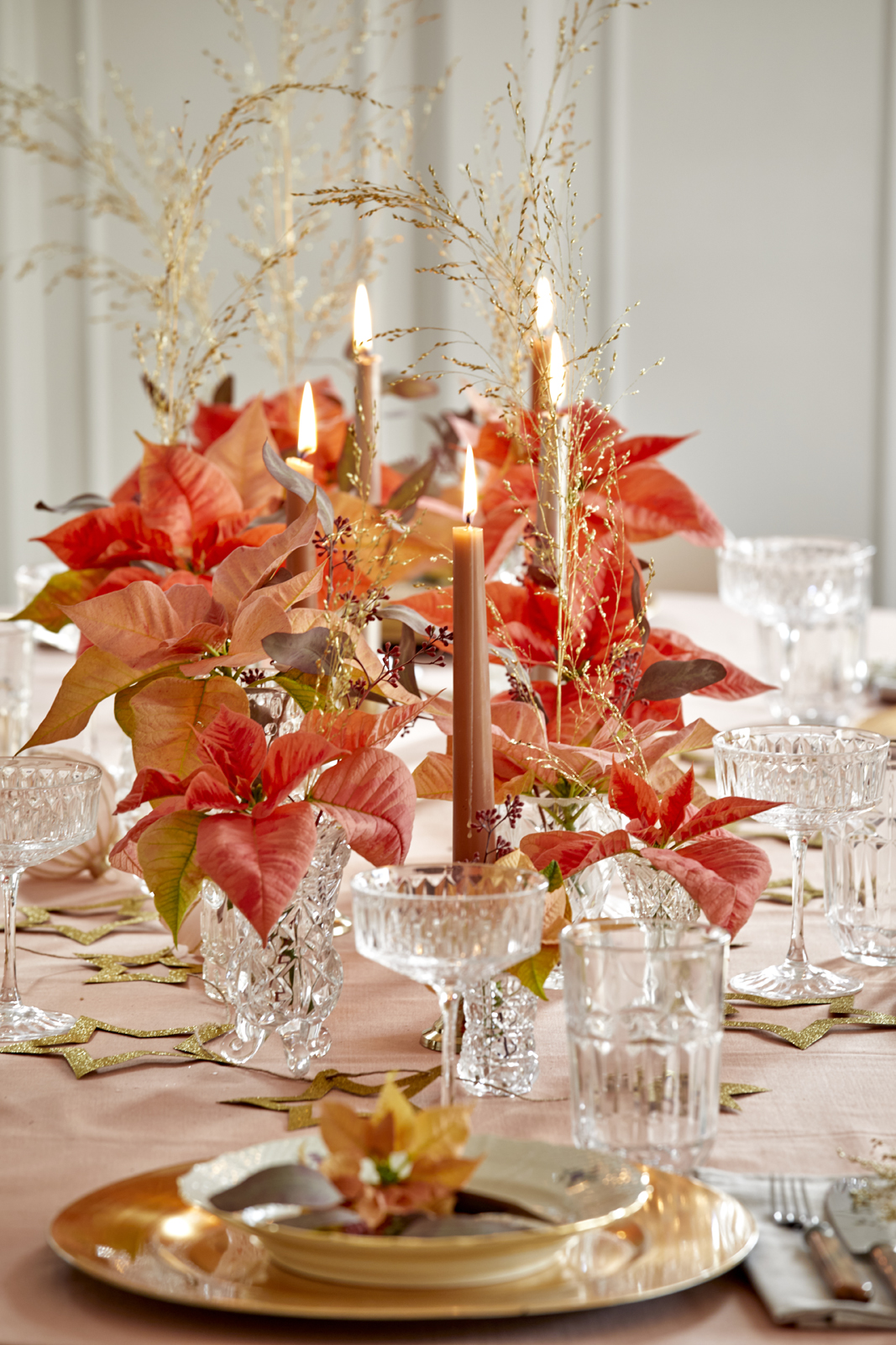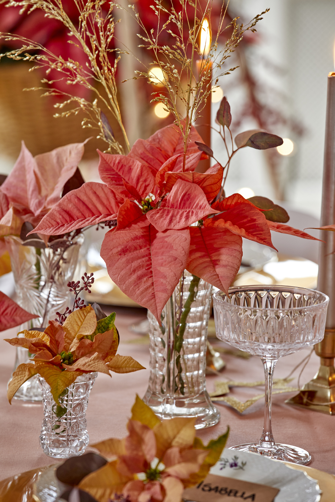 Τα κομμένα αλεξανδρινά παίζουν τον πρωταγωνιστικό ρόλο σε αυτό το παραμυθένιο επιτραπέζιο κομμάτι σε απαλές ροζ αποχρώσεις. Τα στολίδια, τα σερβίτσια, τα κεριά και τα vintage κρυστάλλινα ποτήρια δημιουργούν μια συναρπαστική αντίθεση με το μοντέρνο χριστουγεννιάτικο δέντρο στο βάθος.
