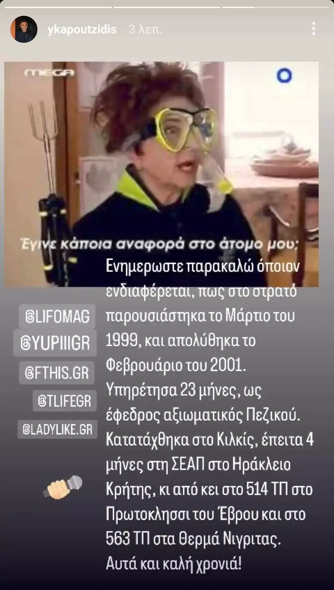 «Ενημερώστε παρακαλώ όποιον ενδιαφέρεται, πως στο στρατό παρουσιάστηκα τον Μάρτιο του 1999 και απολύθηκα τον Φεβρουάριο του 2001. Υπηρέτησα 23 μήνες ως Έφεδρος Αξιωματικός Πεζικού. Κατατάχθηκα στο Κιλκίς, έπειτα τέσσερις μήνες στη ΣΕΑΠ στο Ηράκλειο Κρήτης και από εκεί στο 514 ΤΠ στο Πρωτοκκλήσι του Έβρου και στο 563 ΤΠ στα Θερμά Νιγρίτας».
