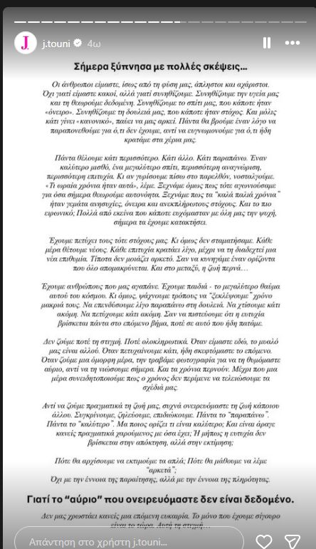 Το πρωί της Πέμπτης 5 Μαρτίου, η Ιωάννα Τούνη μοιράστηκε μέσω ενός μακροσκελούς κειμένου που δημοσίευσε στα Instagram stories της, ορισμένες προσωπικές σκέψεις και προβληματισμούς της σχετικά με το κυνήγι της επιτυχίας και της επίτευξης στόχων.