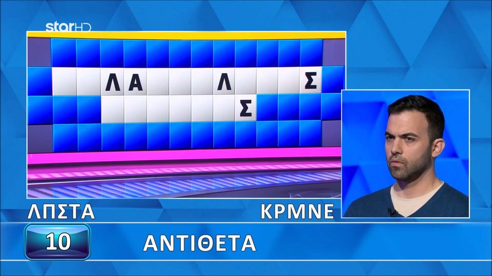 Η κατηγορία ήταν «αντίθετα» και όπως εξήγησε ο ίδιος στο τέλος δεν θα το έβρισκε ακόμα και αν είχε λίγο χρόνο στη διάθεσή του. Η λύση του γρίφου την Πέμπτη (10/4) στον «Τροχό της Τύχης» ήταν: «μελαγχολικός – εύθυμος».