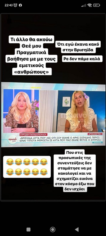 «Τι άλλο θα ακούσω Θεέ μου. Πραγματικά βοήθησέ με με τους εμετικούς ανθρώπους. Ότι εγώ “έκανα κακό στη Βρισηίδα”. Ρε δεν πάμε καλά. Που στις προσωπικές της συνεντεύξεις δεν σταμάτησε να με κακολογεί και να σχηματίζει εικόνα στον έξω κόσμο που δεν ισχύει», έγραψε στο 2ο story.
