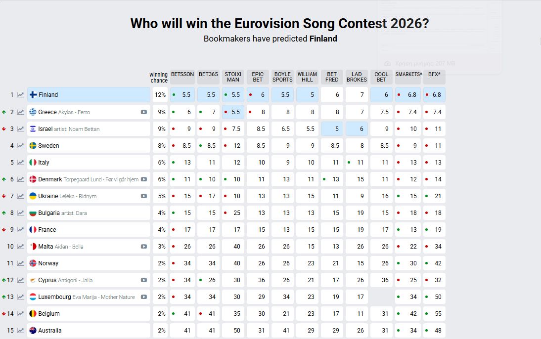 Συγκεκριμένα έχει καταφέρει να σκαρφαλώσει στη δεύτερη θέση των στοιχημάτων, ξεπερνώντας το Ισραήλ και ανεβαίνοντας συνεχώς θέση.