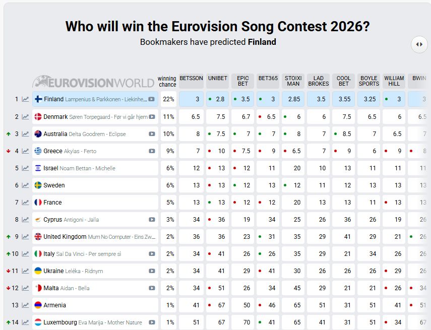 Χαρακτηριστικό παράδειγμα το Ισραήλ, που προ εβδομάδων φιγουράριζε στην κορυφή των πιθανοτήτων νίκης, ενώ ακόμη βρισκόταν σε εξέλιξη η διαδικασία επιλογής τραγουδιού. Πλέον, με την εκπροσώπηση οριστικοποιημένη, οι πιθανότητες που του δίνουν οι bookmakers έχουν υποχωρήσει στο 6%.