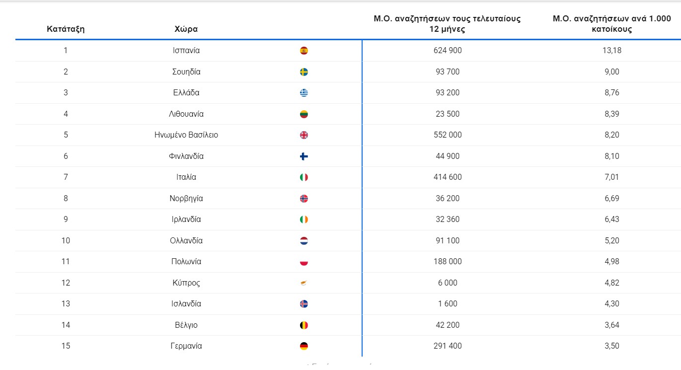 3. Ελλάδα | Συνολικός όγκος αναζήτησης ανά 1.000 κατοίκους: 8.76