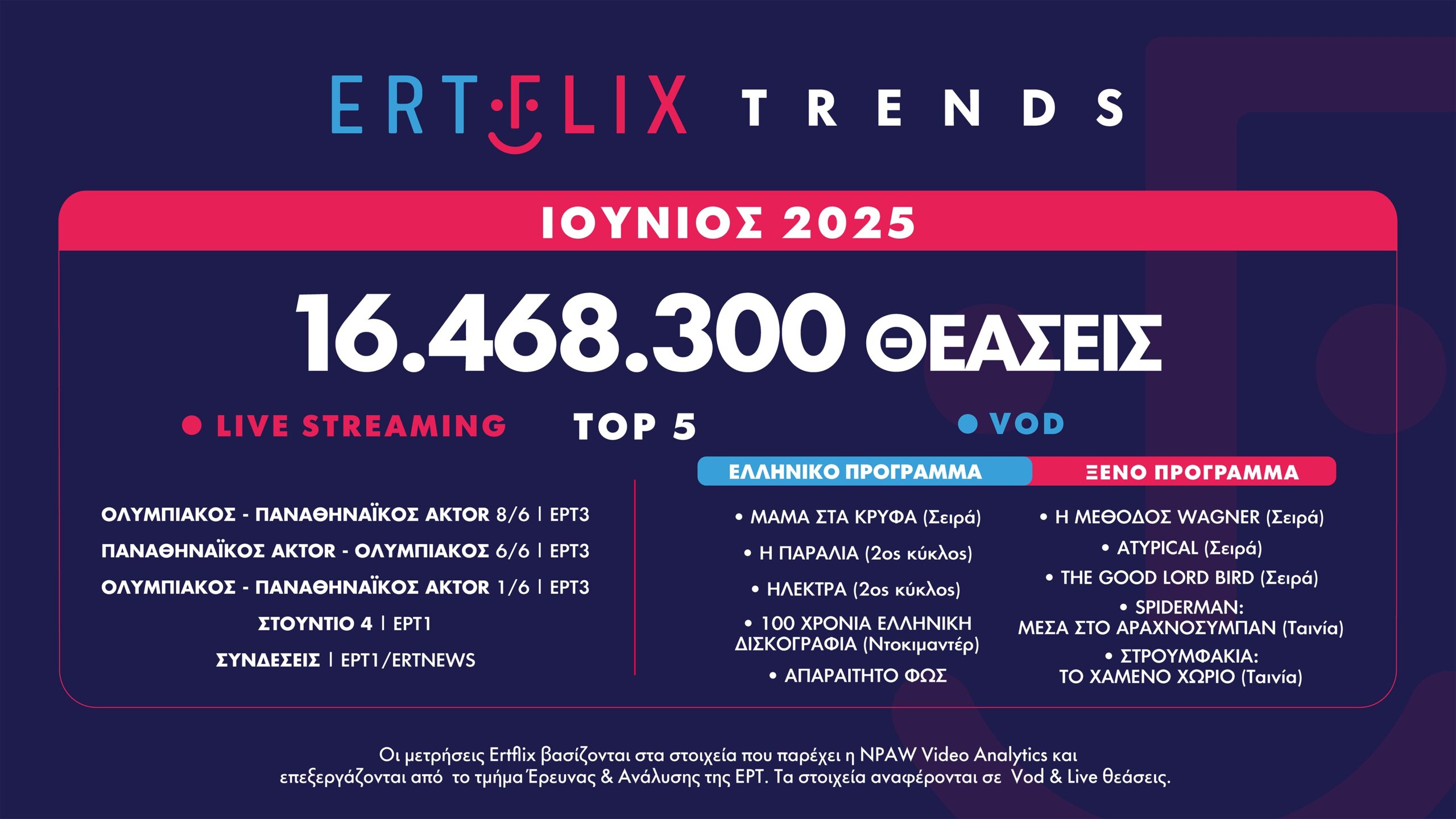 Σύμφωνα με τα στοιχεία της NPAW Video Analytics, που επεξεργάζεται το τμήμα Έρευνας και Ανάλυσης της ΕΡΤ, o Ιούνιος 2025 έκλεισε με 16.468.300 θεάσεις.