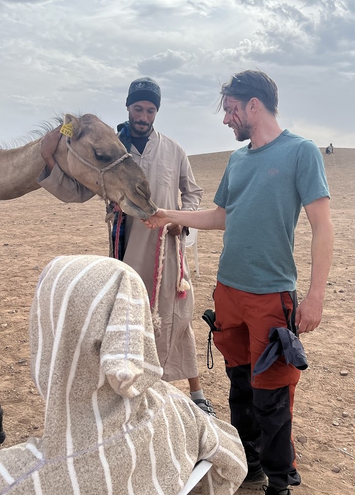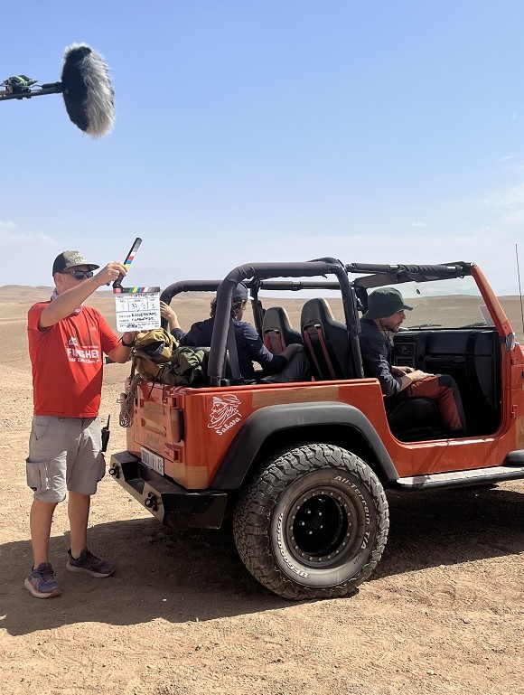 Το… καραβάνι μετά από αρκετή ώρα διαδρομής, στάθμευσε σε συγκεκριμένο σημείο. Αυτοκίνητα, μίνι βαν, φορτηγά με εξοπλισμό, σκηνές, τέντες, καμηλιέρηδες με τις καμήλες τους, πολύχρωμες πινελιές στο “αρειανό” τοπίο. Η αχανής αυτοκρατορία της ερήμου, οι ατελείωτοι αμμώδεις λόφοι, η επανάληψη του ίδιου οπτικού μοτίβου, η γοητεία και η ηρεμία. Μέσα σε αυτό το περιβάλλον τα “action” και “cut” ακούστηκαν πολλές φορές. Στην έρημο ο ήχος αντηχεί διαφορετικά και ταξιδεύει αλλιώς.