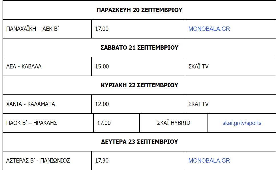 Σέντρα στην τηλεόραση του ΣΚΑΪ με τον αγώνα ΑΕΛ – ΚΑΒΑΛΑ, το Σάββατο 21 Σεπτεμβρίου στις 15.00, ενώ την Κυριακή 22 Σεπτεμβρίου στις 12.00 θα μεταδοθεί η αναμέτρηση ΧΑΝΙΑ – ΚΑΛΑΜΑΤΑ Π.Σ.