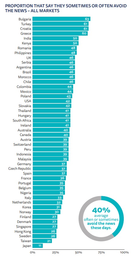 Η έκθεση, η οποία βασίζεται σε δεδομένα από 48 χώρες και έξι ηπείρους, δείχνει ότι η Ελλάδα δεν αποτελεί απλώς μέρος μιας ευρύτερης ευρωπαϊκής τάσης αποστασιοποίησης από την ειδησεογραφία, αλλά έναν από τους πιο χαρακτηριστικούς της εκφραστές. Το φαινόμενο της «αποφυγής ειδήσεων» στην Ελλάδα φτάνει στο 60% — δηλαδή έξι στους δέκα Έλληνες επιλέγουν να μην διαβάζουν ή να μην παρακολουθούν τακτικά ειδήσεις.