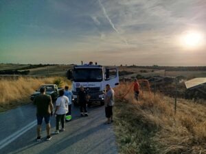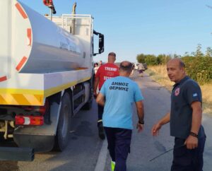 Στο σημείο της φωτιάς, έξω από τον Άγιο Αντώνιο, μετρήσαμε τέσσερα οχήματα της πυροσβεστικής κι άλλα τόσα του Δήμου Θέρμης με εθελοντές και την πρόεδρο της τοπικής κοινότητας Αγίου Αντωνίου – Μονοπήγαδου Μαρία Χαλκίδου. (βλ φωτο)