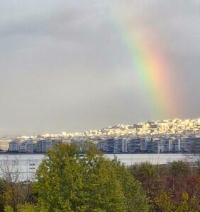 Αυτή ακριβώς η εναλλαγή είναι που κάνει τα ουράνια τόξα τόσο συχνά και φωτεινά εδώ, συχνότερα από πολλές άλλες περιοχές της Ελλάδας. Όταν μάλιστα ο αέρας είναι καθαρός μετά τη βροχή, τα χρώματα γίνονται εξαιρετικά ζωηρά, γιατί δεν υπάρχουν σωματίδια σκόνης που να τα θαμπώνουν. Με λίγα λόγια, το ουράνιο τόξο πάνω από τη Θεσσαλονίκη δεν είναι τυχαίο ούτε σπάνιο είναι η φυσική συνέπεια του κλίματος, της θέσης της πόλης δίπλα στη θάλασσα και του ότι ο ήλιος δύει ακριβώς απέναντι από την κατεύθυνση που συνήθως φεύγει η βροχή. Γι’ αυτό και σχεδόν όλοι οι Θεσσαλονικείς έχουν τουλάχιστον μία φωτογραφία με το Λευκό Πύργο ή τον Όλυμπο να φωτίζονται κάτω από μια πολύχρωμη καμάρα, σαν ο ουρανός να χαμογελάει ακριβώς πάνω από την πόλη μας ΠΗΓΕΣ: https://www.sciencedirect.com/science/article/abs/pii/S037015730100076X – https://www.researchgate.net/publication/269929976_Physics_of_rainbow