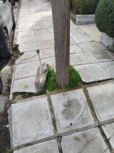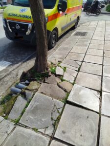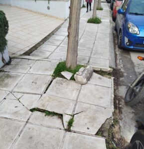 Η μετακίνηση πεζών έχει μετατραπεί σε… δοκιμασία, όπως φαίνεται από τις δεκάδες αναφορές πολιτών σε σχετική δημοτική πλατφόρμα. Οι ρίζες των δέντρων εισχωρούν κάτω από τις πλάκες των πεζοδρομίων, τις ανασηκώνουν… επικίνδυνα και δημιουργούν ανωμαλίες που προκαλούν πτώσεις και ατυχήματα!
