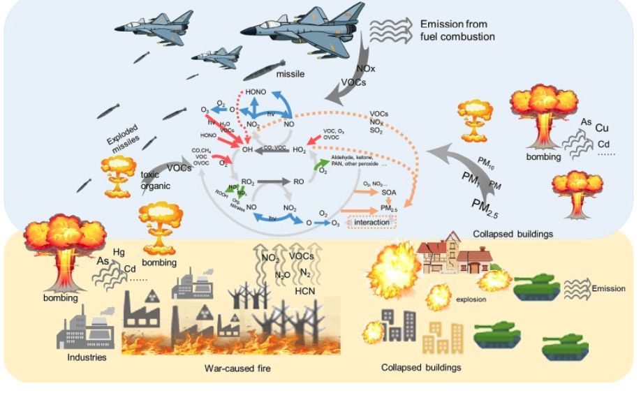 Μία από τα ίδια επαναλαμβάνεται σε ευρύτερη κλίμακα στην Ευρώπη. Μετά την έναρξη του πολέμου Ρωσίας-Ουκρανίας, οι μετρήσεις σε πόλεις κοντά στις ζώνες συγκρούσεων έδειξαν αύξηση κατά περίπου 10-30% στα PM2.5 και το διοξείδιο του αζώτου, ενώ το όζον μειώθηκε. Οι ερευνητές σημειώνουν ότι αυτές οι πολεμικές δραστηριότητες ανέτρεψαν ακόμα και τα οφέλη που είχε φέρει η πανδημία του Covid από τις λιγότερες μετακινήσεις. Η ρύπανση έγινε πιο περίπλοκη χημικά, δημιουργώντας ένα «κοκτέιλ» που δυσκολεύει την ανάκαμψη της ατμόσφαιρας. Πιο πρόσφατες μετρήσεις στο Κίεβο, τον Ιούνιο του 2025, κατά τη διάρκεια επιθέσεων με πυραύλους και drones, κατέγραψαν κορυφές PM2.5 έως 241 μικρογραμμάρια ανά κυβικό μέτρο, υπερ-δεκαπλάσια από τα ασφαλή όρια του Παγκόσμιου Οργανισμού Υγείας! Ο καπνός από τις πυρκαγιές που ξέσπασαν σε κατοικίες και βιομηχανικά κτίρια σκέπασε το μισό της πόλης, μεταφέροντας σωματίδια σε μεγάλες αποστάσεις. Οι πολίτες που χρησιμοποιούν απλά αισθητήρια παρακολούθησης μπόρεσαν να δουν σε πραγματικό χρόνο πώς οι εκρήξεις μετατρέπουν τον αέρα σε τοξικό νέφος. Και όλα αυτά χωρίς να υπάρχει άμεση έκρηξη δίπλα τους.