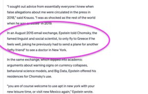 Εκείνο στο οποίο εύκολα καταλήγουμε, με μια αρχική ανάγνωση των αμέτρητων αρχείων, είναι ότι δεν υπάρχουν όρια στις «απολαύσεις» τους. Το δε “little black book”, δηλαδή η ατζέντα του μαστροπού και της συνεργού του, μια λίστα με 1.500-2.000 ονόματα συμπριλαμβάνει τους ισχυρότερους του πλανήτη. Τα διεθνή ΜΜΕ εστιάζουν σχεδόν αποκλειστικά σε Αμερικανούς/Βρετανούς ενώ οι “περιφερειακές” συνδέσεις προσωπικοτήτων πχ με Αθήνα, Μόσχα, Ντουμπάι κλπ μένουν στο περιθώριο. Συνολικά, τα έγγραφα αποκαλύπτουν ένα παγκόσμιο δίκτυο που δεν ξεδιπλώνεται σε όλο του το… μεγαλείο. Να θυμίσουμε ότι στο τέλος της περασμένης χρονιάς είχε δημοσιοποιηθεί και αναδειχθεί η φιλία διανοούμενου με τον σωματέμπορα. Σε email του 2015 ο Epstein μιλάει με τον Noam Chomsky για επίσκεψη στην Ελλάδα λέγοντας “μην πας αν δεν είσαι καλά, γιατί είχα στείλει αεροπλάνο για άλλον… αριστερό φίλο” (βλ φωτο)