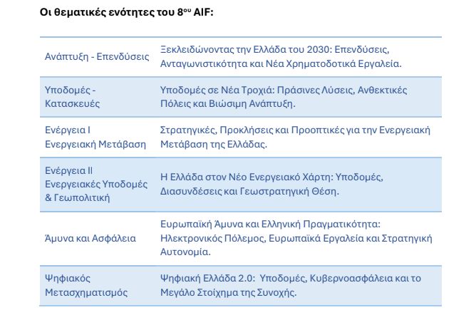 Σε συντονισμό με τις προτεραιότητες της αγοράς και τις διεθνείς τάσεις, το 8ο AIF παρουσιάζει μια θεματολογία αιχμής, με σταθερούς πυλώνες τις ενότητες Ανάπτυξη – Επενδύσεις, Υποδομές – Κατασκευές, Ενέργεια και Ψηφιακός Μετασχηματισμός. Φέτος, εισάγεται για πρώτη φορά η ενότητα Άμυνα και Ασφάλεια, υπογραμμίζοντας τη σημασία ενός τομέα που αποκτά ολοένα και μεγαλύτερη βαρύτητα στην Ευρώπη και διεθνώς. Η ενότητα θα επικεντρωθεί στη συμβολή της άμυνας στην ενίσχυση της εθνικής ασφάλειας, την τεχνολογική αυτοδυναμία και την αξιοποίηση ευρωπαϊκών εργαλείων συνεργασίας, αναδεικνύοντας τον ρόλο της Ελλάδας ως αξιόπιστου εταίρου σε μια εποχή γεωπολιτικής ρευστότητας.