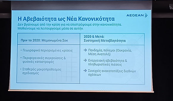 Όπως επισήμανε η κα. Σιδηροπούλου, το 60% των αναγκών της AEGEAN είναι καλυμμένο από την προαγορά, ωστόσο ένα 40% παραμένει εκτεθειμένο στις έντονες διακυμάνσεις των τιμών, οι οποίες κινούνται περίπου στο διπλάσιο σε σχέση με πέρυσι.