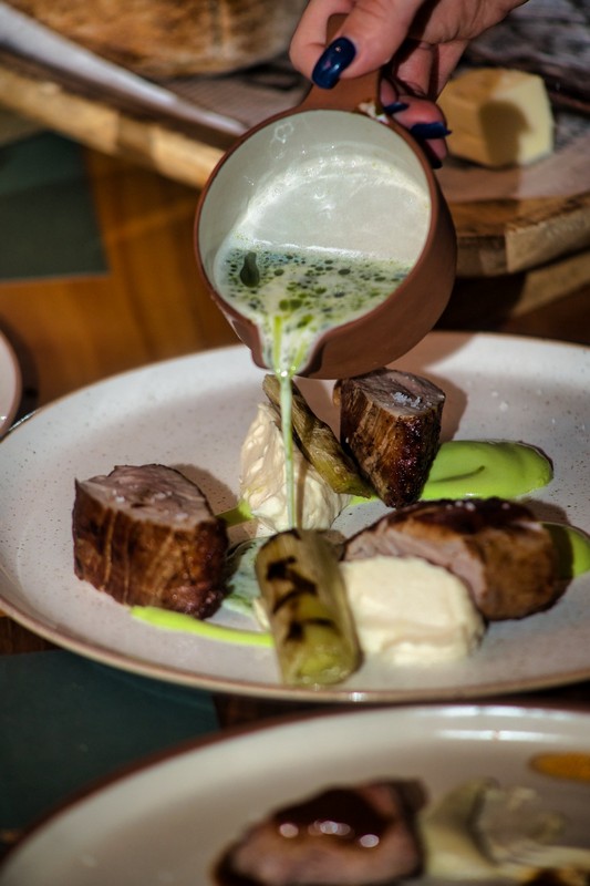 Στα κυρίως πιάτα, το μενού συνεχίζει με μοσχαράκι με μελιτζάνα σε διαφορετικές υφές, γλυκό σκόρδο και σάλτσα κόκκινου κρασιού με τομάτα, κοτόπουλο λεμονάτο με πουρέ από πατάτες φούρνου και σάλτσα φρέσκιας ρίγανης, χοιρινό φιλέτο με πουρέ σελινόριζας, πράσο και σάλτσα βουτύρου, αλλά και φιλέτο τσιπούρας με χόρτα, αρακά, φρέσκα μυρωδικά και σάλτσα από μύδια, κουρκουμά και στάκα Χανίων.