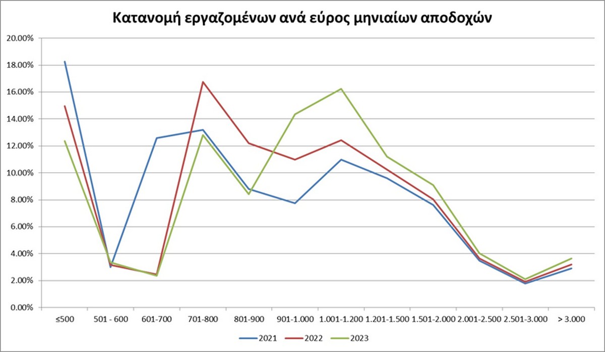 Την ίδια στιγμή, παρατηρείται μια μετατόπιση των εργαζομένων σε υψηλότερα μισθολογικά κλιμάκια, όπως αποτυπώνεται και στο διάγραμμα.