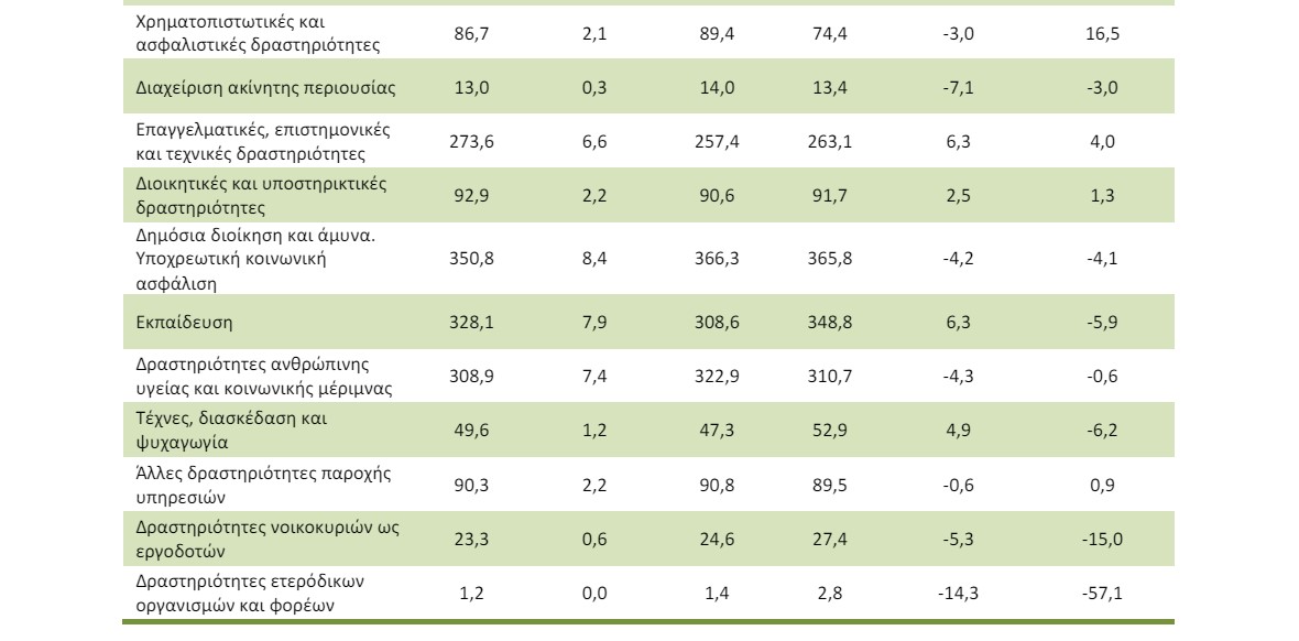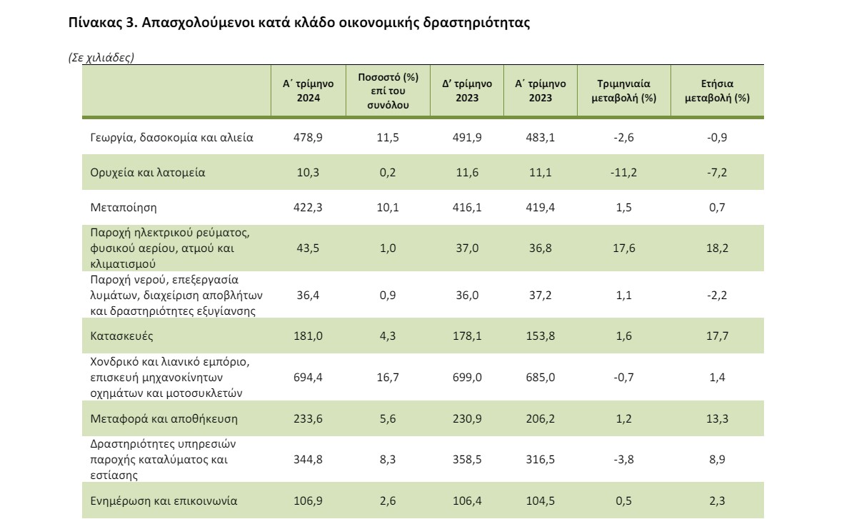 Ειδικότερα, ο αριθμός των απασχολουμένων ανήλθε σε 4.173.424 άτομα παρουσιάζοντας μείωση κατά 0,2%, σε σχέση με το προηγούμενο τρίμηνο και αύξηση κατά 1,8%, σε σχέση με το αντίστοιχο τρίμηνο του προηγούμενου έτους.