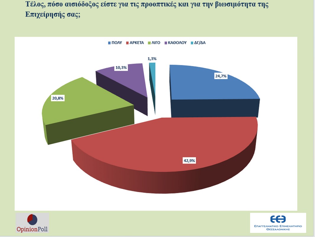 – Υπάρχει απαισιοδοξία ως προς την βιωσιμότητα Επιχειρήσεων από περίπου έναν στους τρεις . Το 20.8% δηλώνει λίγο και το 10.3% καθόλου αισιόδοξο για τις προοπτικές και την βιωσιμότητα της Επιχείρησής του. Το 24.7% δηλώνει πολύ αισιόδοξο και το 42.9% αρκετά.