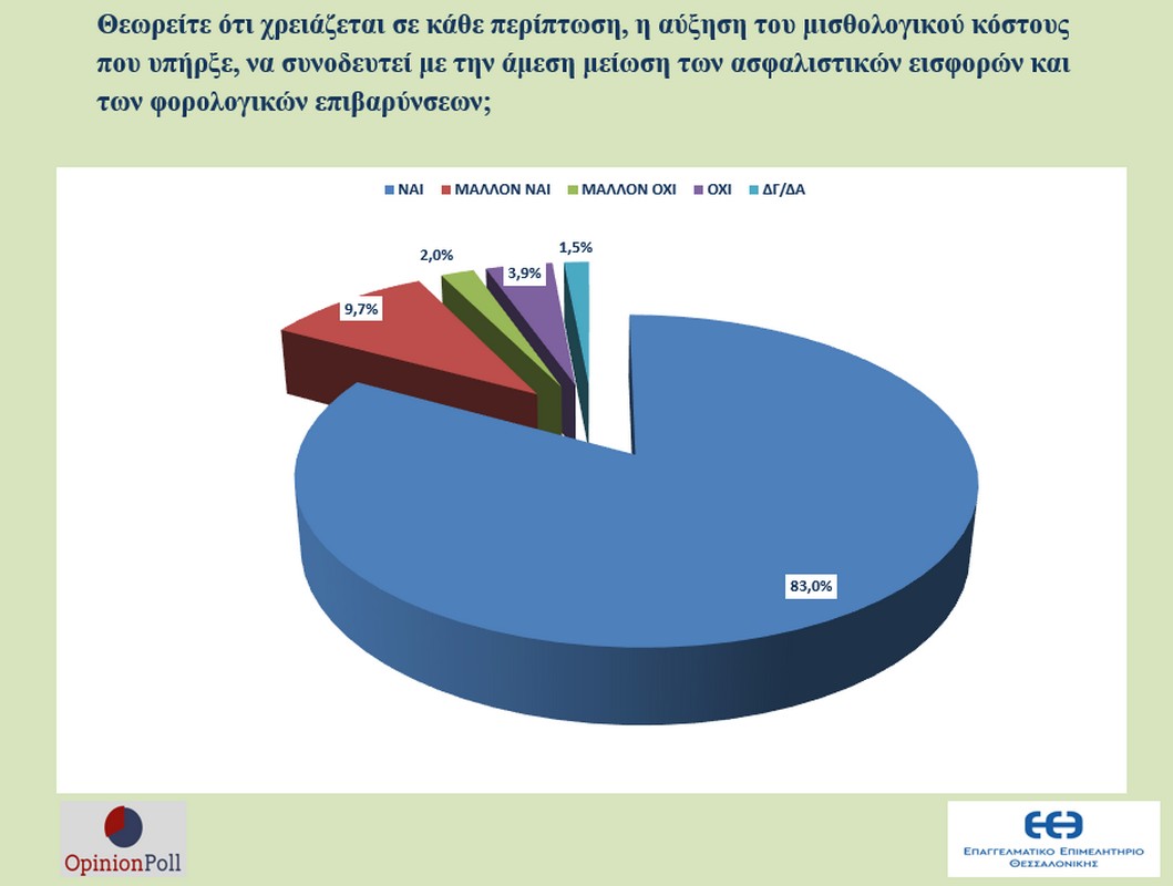 – Τεράστιο ποσοστό της τάξης του 92.7% ( ΝΑΙ και μάλλον ΝΑΙ) θεωρεί, ότι η αύξηση του μισθολογικού κόστους που υπήρξε, χρειάζεται να συνοδευτεί με την άμεση μείωση των ασφαλιστικών εισφορών και των φορολογικών επιβαρύνσεων. Αντίθετη άποψη έχει μόλις το 5.9%.