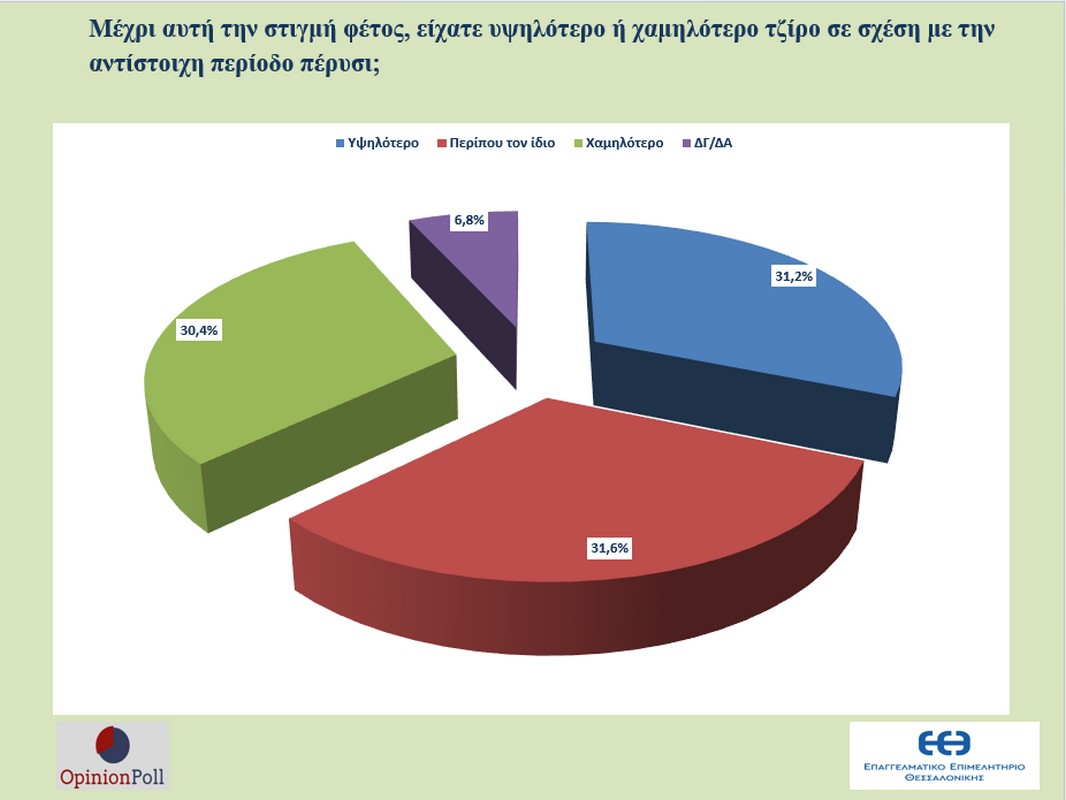 – Σε σχέση με την σύγκριση του φετινού τζίρου μέχρι αυτή την στιγμή, με την αντίστοιχη περίοδο πέρυσι, η εικόνα εμφανίζεται κυριολεκτικά χωρισμένη στα τρία: Το 31.6% δηλώνει ότι έχει περίπου τον ίδιο τζίρο με πέρυσι, το 31.2% υψηλότερο και τον 30.4% χαμηλότερο.