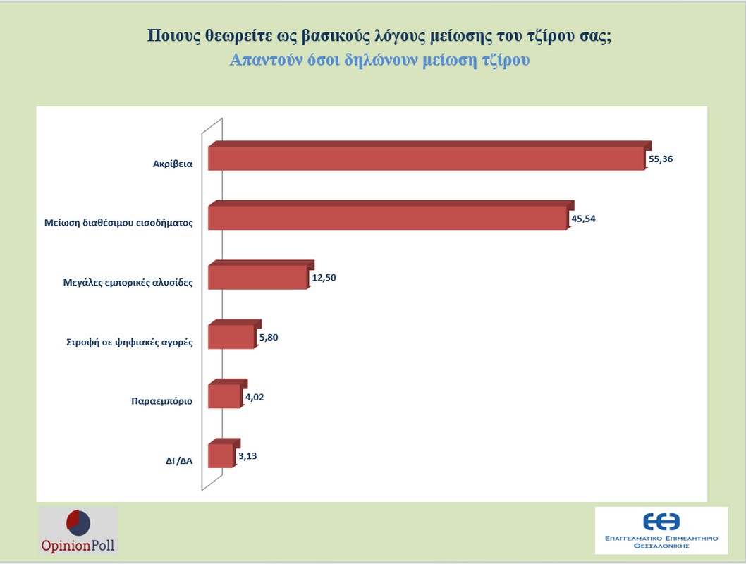 – Ως βασικοί λόγοι μείωσης του τζίρου σύμφωνα με τους ερωτηθέντες, είναι η ακρίβεια με 55.36%, η μείωση του διαθέσιμου εισοδήματος με 45.54% και ακολουθούν, οι μεγάλες εμπορικές αλυσίδες με 12.5%, η στροφή σε ψηφιακές αγορές με 5.8% και το παρεμπόριο με 4%.