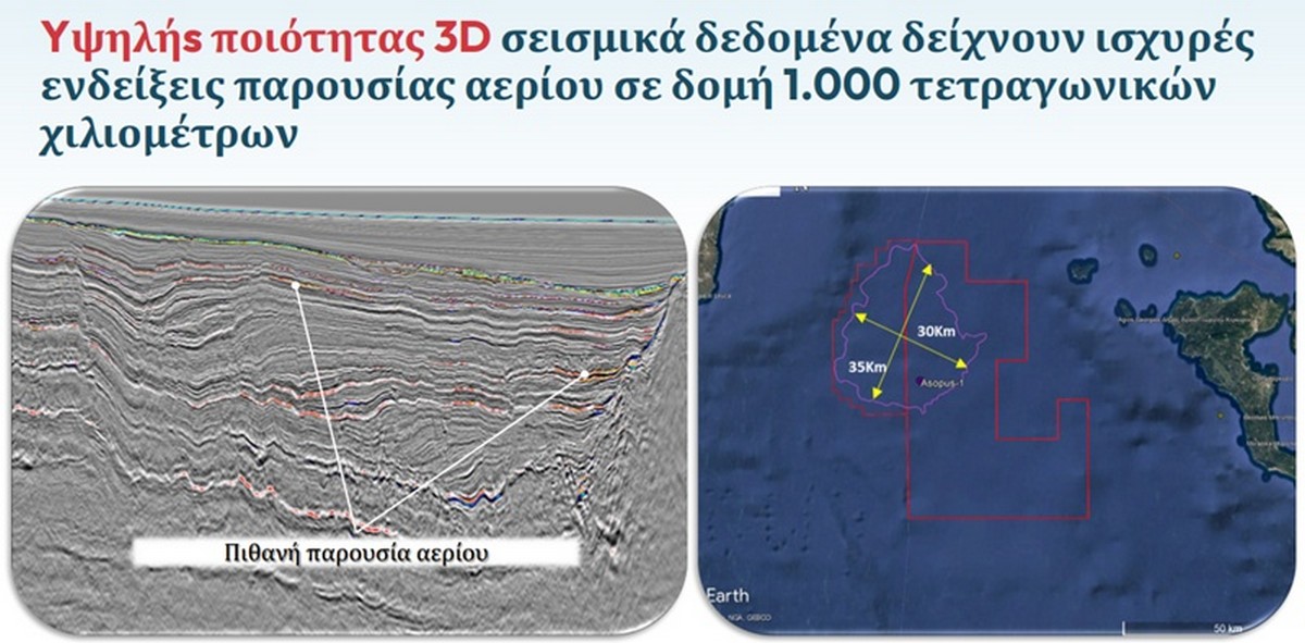 Η «ακτινογραφία» αυτή προέκυψε από τις τρισδιάστατες σεισμικές έρευνες που πραγματοποιήθηκαν το 2022 σε έκταση 1.000 τετραγωνικών χιλιομέτρων από τις οποίες προσδιορίστηκε, αφενός, ο στόχος του «Ασωπού» σε βάθος 4.622 μέτρων και αφετέρου η εκτίμηση για το δυναμικό της περιοχής που φθάνει στα 270 δισ. κυβικά μέτρα φυσικού αερίου. Μέγεθος τεράστιο για τα ελληνικά δεδομένα (καθώς η ετήσια κατανάλωση της χώρας μας κυμαίνεται στα 6-7 δισ.), ακόμη και αν ληφθεί υπόψη ότι αντλείται το 50 – 60 % της συνολικής ποσότητας.