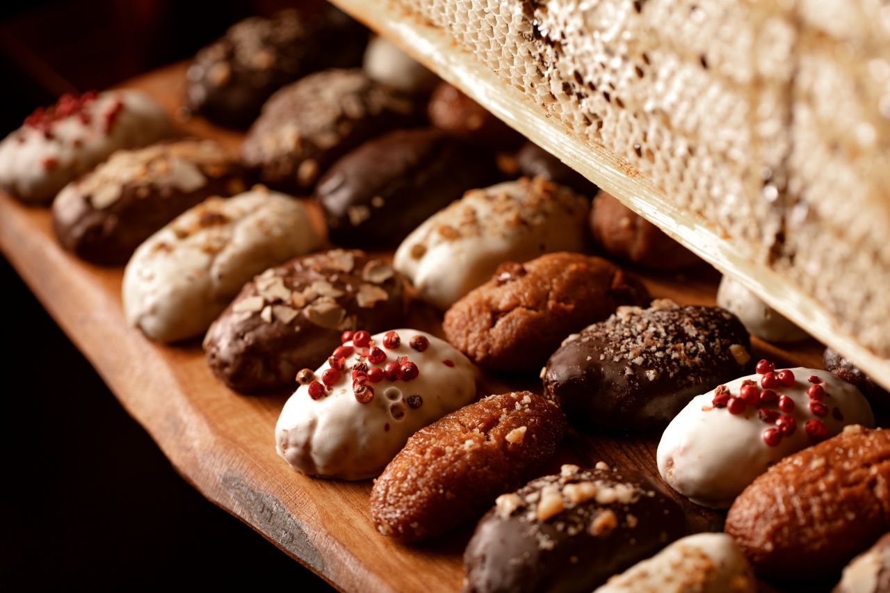 Με την είσοδο σας στο κατάστημα, θα «χαθείτε» ανάμεσα σε πολλές επιλογές σε ό,τι αφορά τα μελομακάρονα. Χειροποίητα μελομακάρονα με λευκή βελγική σοκολάτα και ροζ πιπέρι, με απλή λευκή βελγική σοκολάτα, σε red velvet εκδοχή, με λευκή βελγική σοκολάτα και Oreo, με σκούρη σοκολάτα και κάστανο, με βέλγικη σοκολάτα γάλακτος ή μαύρη, καθώς και με βελγική σοκολάτα γάλακτος και φουντούκι.