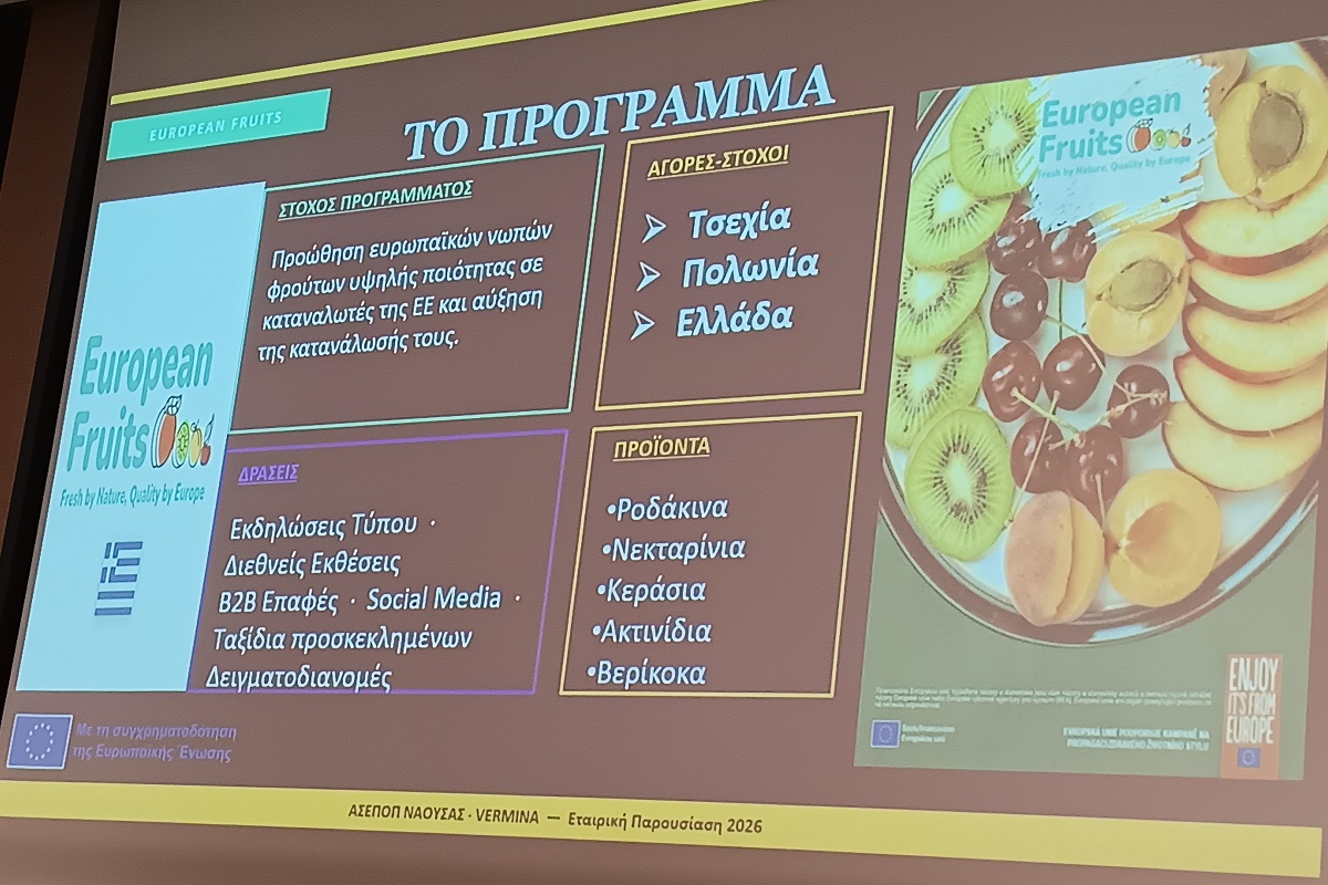 Από την πλευρά του, όπως επισήμανε ο γενικός διευθυντής του ΑΣΕΠΟΠ Νάουσας Βασίλης Μπουγάς, «επενδύουμε διαχρονικά στην ποιότητα και την εξωστρέφεια, αξιοποιώντας σύγχρονες πρακτικές και συμμετέχοντας ενεργά σε ευρωπαϊκά προγράμματα προώθησης, όπως το European Fruits». Όπως επισήμανε το εν λόγω πρόγραμμα υλοποιείται στο πλαίσιο του κανονισμού 1144 και αποτελεί σημαντικό εργαλείο για την ενίσχυση της παρουσίας των ευρωπαϊκών φρούτων σε ανταγωνιστικές αγορές.