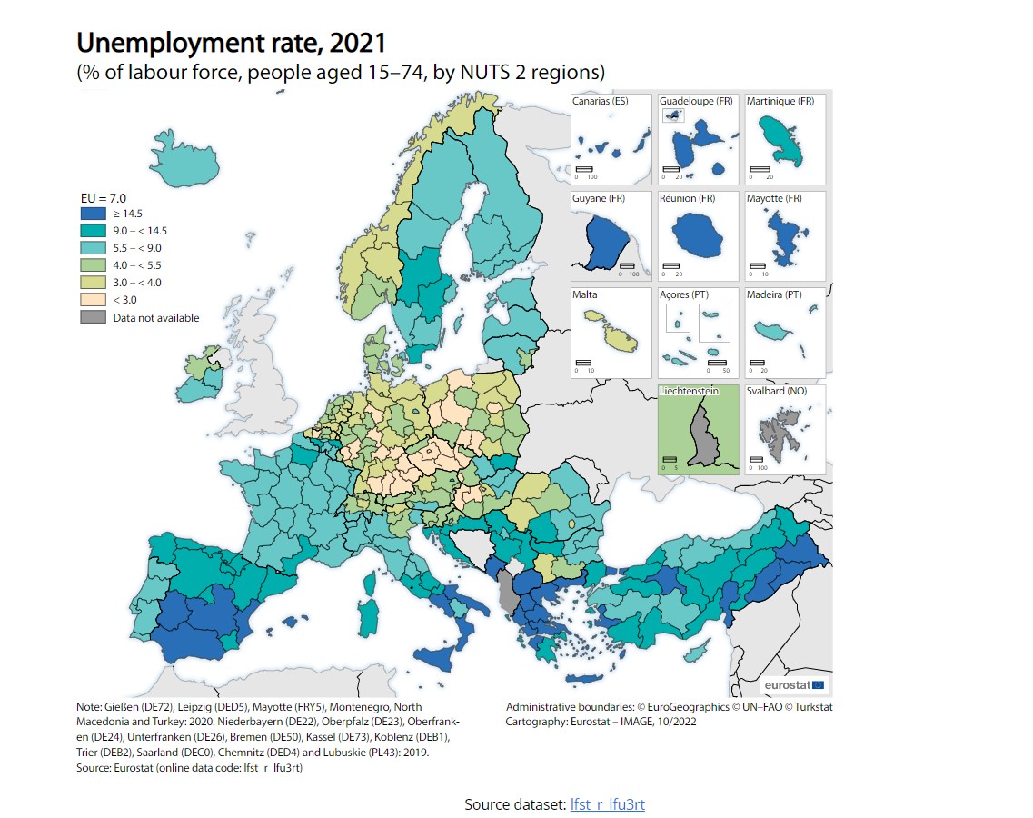 Όσον αφορά το συνολικό ποσοστό ανεργίας στις περιφέρειες επιπέδου NUTS 2, το 2021, τα υψηλότερα ποσοστά ανεργίας καταγράφηκαν στις νότιες και εξόχως απόκεντρες περιφέρειες της ΕΕ: περιφερειακά ποσοστά ανεργίας τουλάχιστον 14,5 % καταγράφηκαν σε 9 από τις 13 περιφέρειες της Ελλάδας (οι εξαιρέσεις είναι η πρωτεύουσα της Αττικής, η Πελοπόννησος, τα Ιόνια Νησιά και το Βόρειο Αιγαίο), 8 περιφέρειες από την Ισπανία, 4 από τις εξόχως απόκεντρες περιοχές της Γαλλίας και 4 περιφέρειες από το νότιο μισό της Ιταλίας.