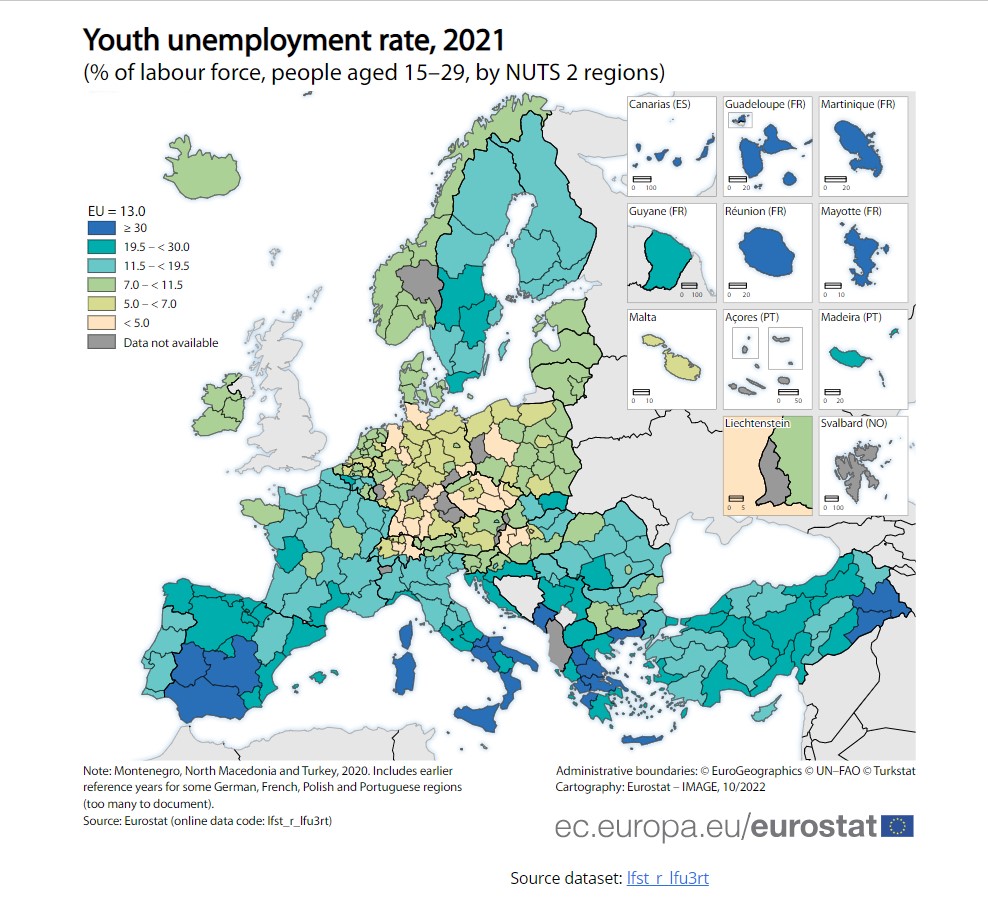 Το ποσοστό ανεργίας των νέων στην ΕΕ (13,0%) ήταν σχεδόν διπλάσιο από το συνολικό ποσοστό ανεργίας (7,0%) το 2021 και υψηλότερο από το συνολικό ποσοστό ανεργίας (για άτομα ηλικίας 15–74 ετών) σε καθεμία από τις 192 περιφέρειες επιπέδου 2 NUTS για το οποίο υπάρχουν διαθέσιμα δεδομένα.