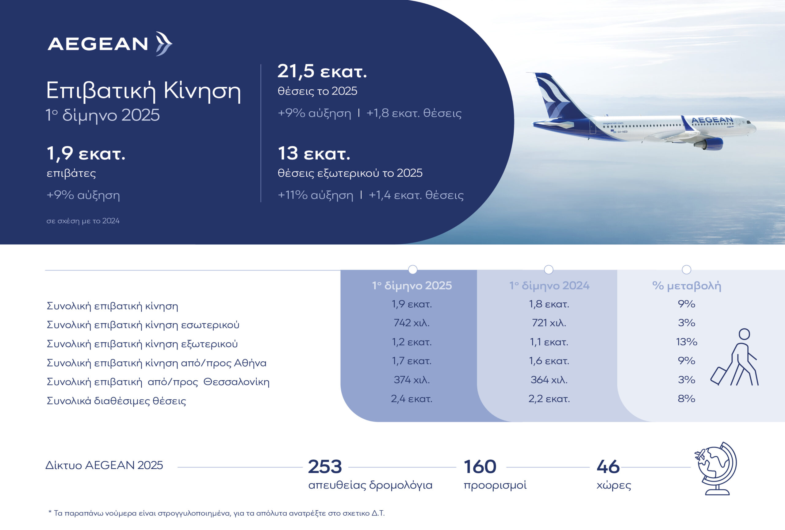Για το 2025, η AEGEAN συνεχίζοντας τη στρατηγική ενίσχυσης της δραστηριότητάς της θα προσφέρει περίπου 21,5 εκατ. θέσεις,.