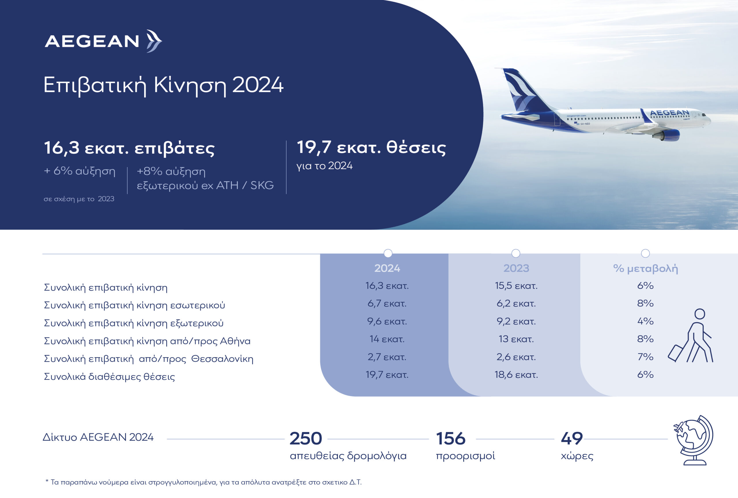 Συνολικά το 2024 η AEGEAN μετέφερε 16,3 εκατ. επιβάτες, καταγράφοντας για το 2024 ετήσια αύξηση 6% σε σχέση με το 2023, έχοντας προσφέρει περισσότερες από 19,7 εκατ. θέσεις, αυξημένες κατά 1,1 εκατ. παρά τις επιχειρησιακές και γεωπολιτικές προκλήσεις και κατέγραψε ένα ακόμη, νέο ιστορικό υψηλό στην επιβατική κίνηση της εταιρείας.