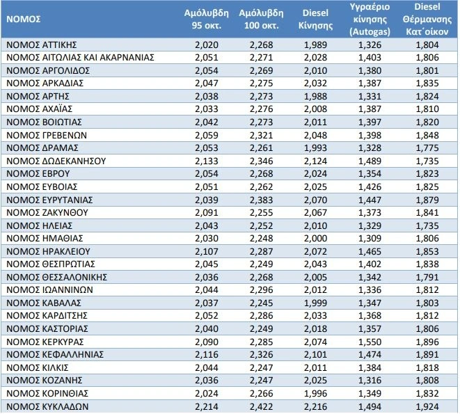 Παράλληλα, στις Κυκλάδες και στα Δωδεκάνησα καταγράφονται και οι υψηλότερες τιμές πετρελαίου κίνησης με 2,216 ευρώ/λίτρο και 2,124 ευρώ/λίτρο, αντίστοιχα.