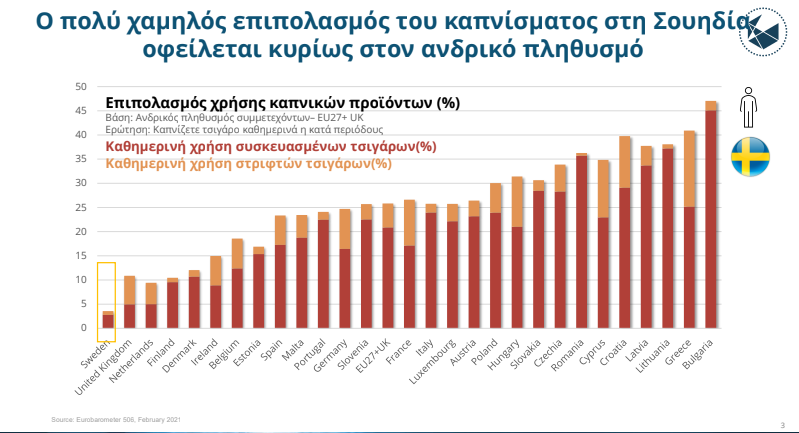 Στο πλαίσιο της συζήτησης, παρουσιάστηκε και το παράδειγμα της Ελλάδας, όπου η επιλογή ενός σύγχρονου αλλά, παράλληλα, αυστηρού ρυθμιστικού πλαισίου που δεν απαγορεύει την κυκλοφορία των εναλλακτικών προϊόντων και ταυτόχρονα εξασφαλίζει τη δυνατότητα για έγκυρη ενημέρωση των καπνιστών, φαίνεται πως έχει επιφέρει, ορατά και μετρήσιμα αποτελέσματα για τη μείωση του καπνίσματος στην Ελλάδα. Είναι χαρακτηριστικό ότι σύμφωνα με τα στοιχεία του Ευρωβαρόμετρου, η Ελλάδα έχει πετύχει μείωση του καπνίσματος κατά 6 ποσοστιαίες μονάδες την περίοδο 2021–2023, από 42% σε 36%. Πρόκειται για τη δεύτερη καλύτερη επίδοση στην Ε.Ε.-27, μετά την Τσεχία, η οποία εφαρμόζει παρόμοια πολιτική.