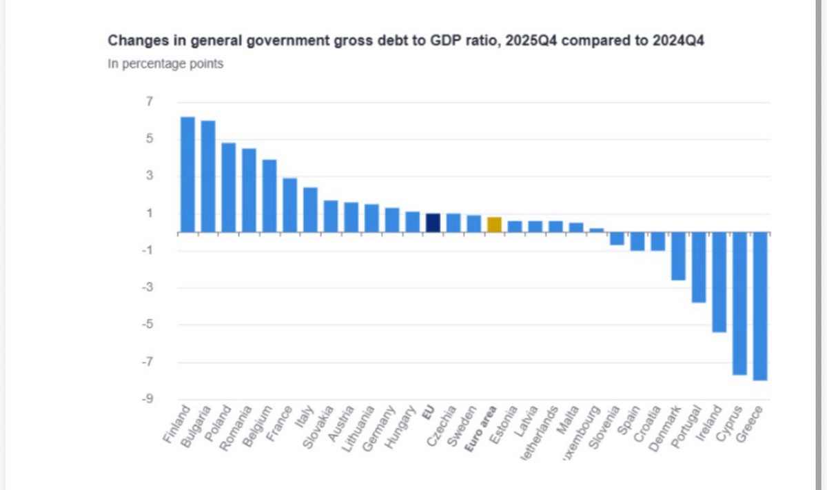 Η μοναδική χώρα με ανάλογες επιδόσεις είναι η Κύπρος, η οποία μεταξύ 2021 και 2025 βελτίωσε τον δείκτη χρέους προς ΑΕΠ κατά 62,5 μονάδες.